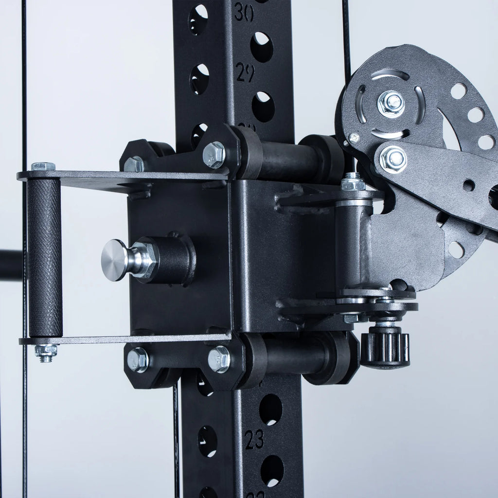 The rack integrates a dual-action adjustable cable system connected to two 105kg weight stacks. There are 4 additional pulley positions, 2 up high for pulldown exercises, and 2 down low for rows. These cable positions can be connected to achieve the equivalent of a 1:1 ratio on the 105KG weight stacks.