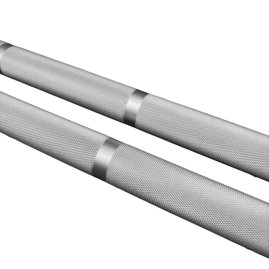 The Knurled straight handles can be removed and repositioned to create three distinct width options. The flared handle layout supports different shoulder structures and training preferences. Knurl reference marks help maintain consistent hand placement across sets and sessions.