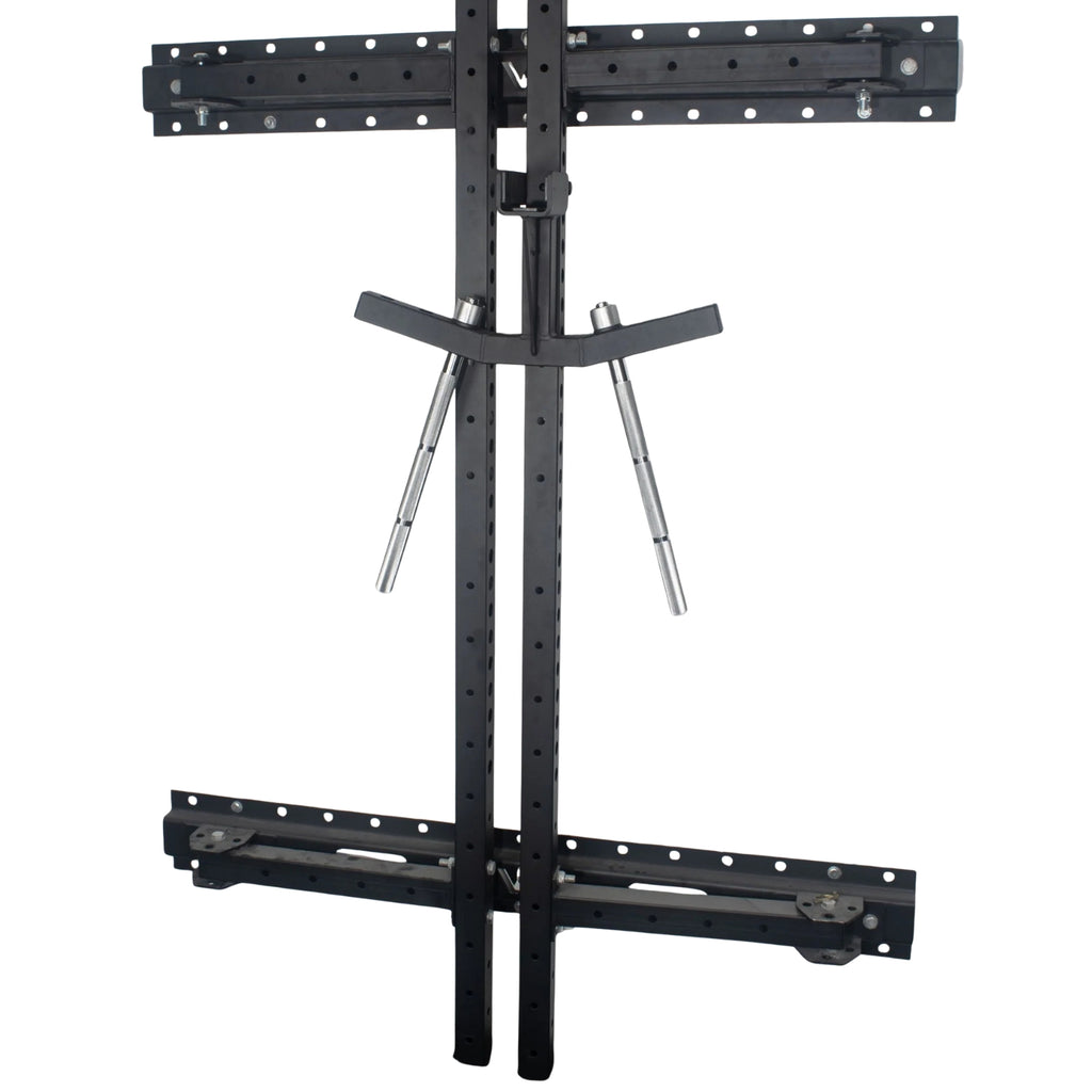 The unit stores vertically against rack uprights when not in use. HDPE protective plastic is installed on all rack contact points to reduce wear on both the dip station and the rack frame.