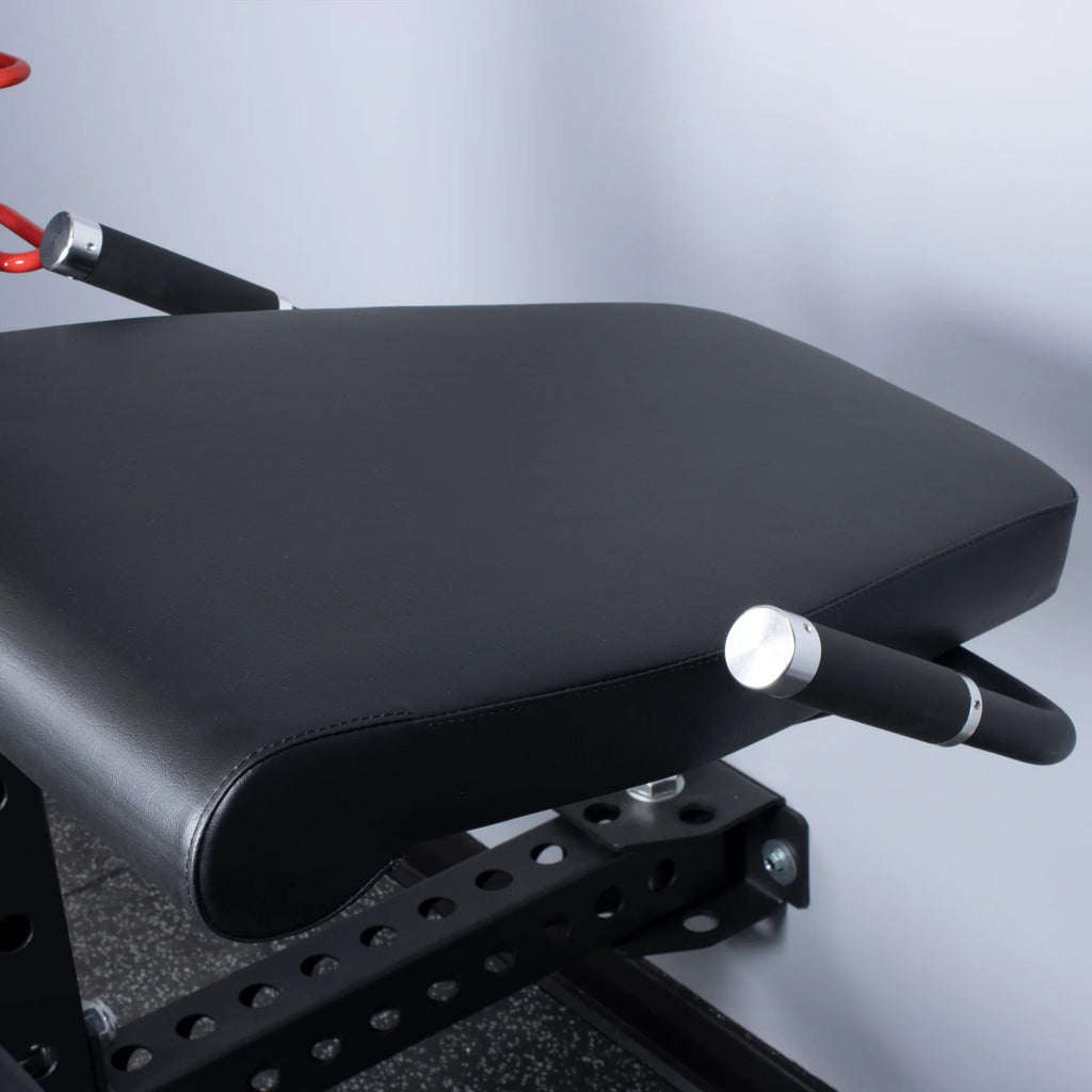 Rubber-coated side handles provide bracing during heavy sets. The attachment includes a padded seat and roller as standard. A black powder coat finish improves durability under repeated use.